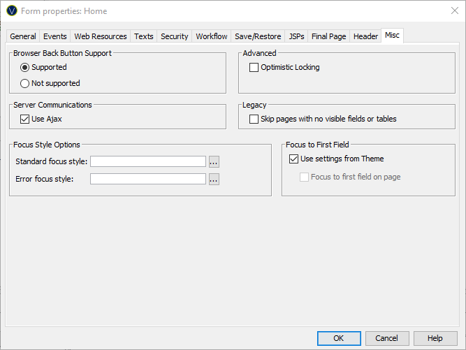 The following properties are available in the Misc tab of the Form Properties dialog.