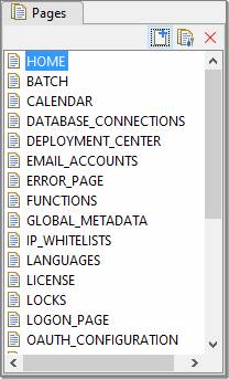 The pages view consists of the pages toolbar followed by a list of all pages in the form. The pages are shown in display order (starting with the forms first page then following the next page link) so far as this is possible. Clicking on a page displays the Page Properties in the Properties View.