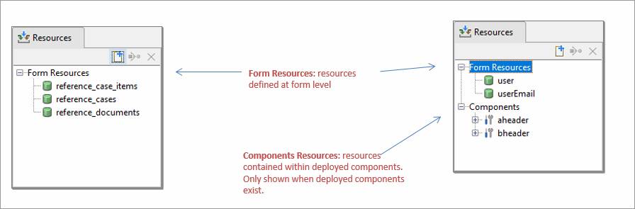 The Resources View contains a list of resources available to the parent Form/Application Layout/Component/Integration Service or Workflow Process. A resource must be added to this view before the resource fields can be mapped or the resource is referred to in a scripting statement. Resources contained within deployed components are only shown if deployed components exist and are then shown under the prefix name for each deployed component. Application Layout resources are not shown on the Forms Resource View.