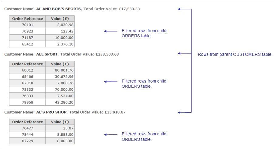 The example below shows a child Table Control (orders) nested within a parent Repeater Control (customers):